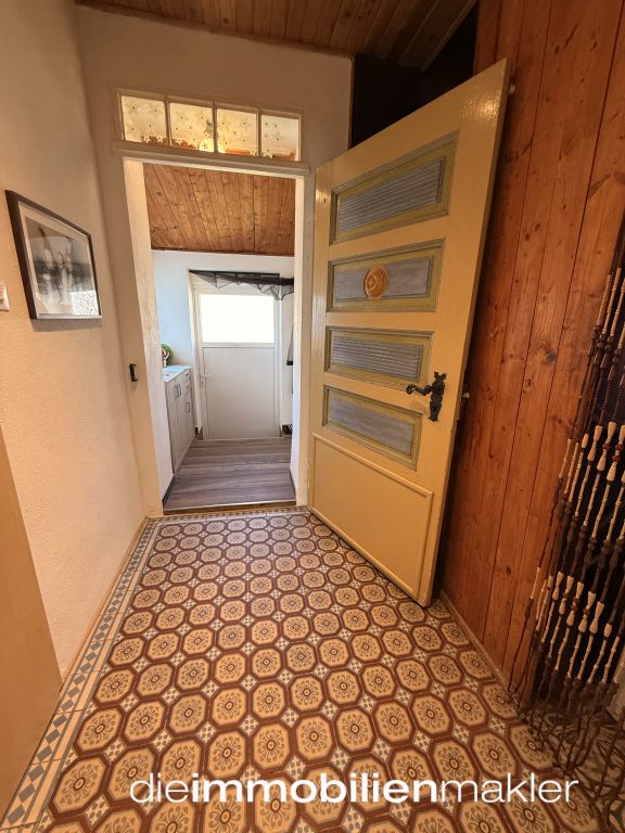 Bodenfliesen und eine charaktervolle Tür verleihen dem Eingangsbereich eine ganz besondere Atmosphäre. Im Erdgeschoss befinden sich neben der Küche mit Kochmaschine, ein gemütliches Wohnzimmer sowie ein kleines Schlafzimmer. Ein vorgelagerter Anbau beherbergt das Badezimmer.