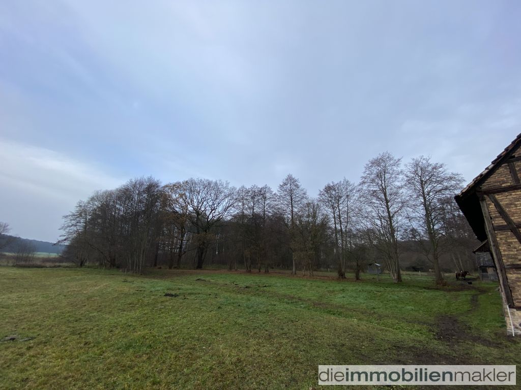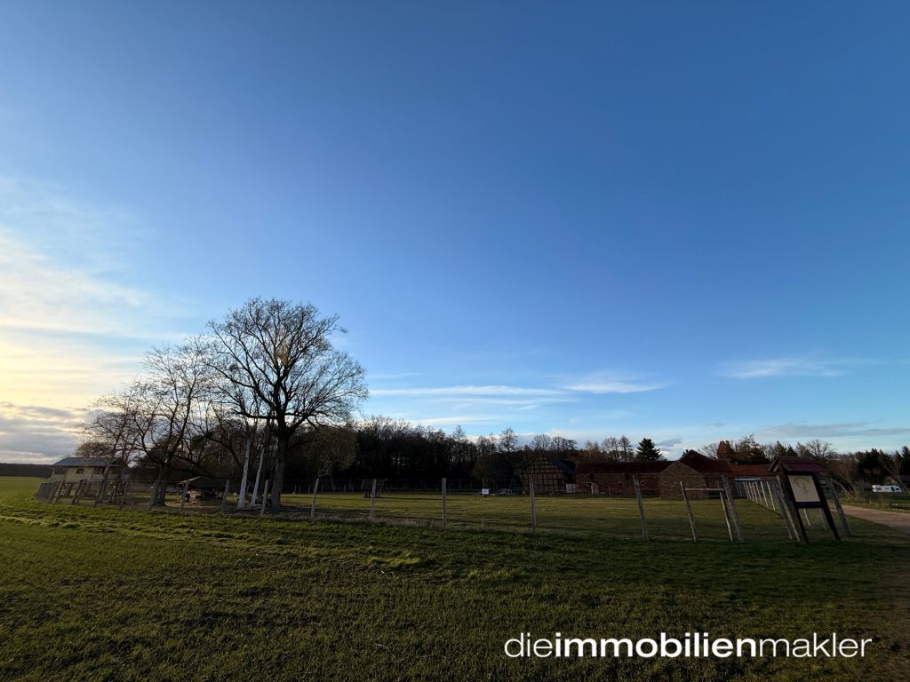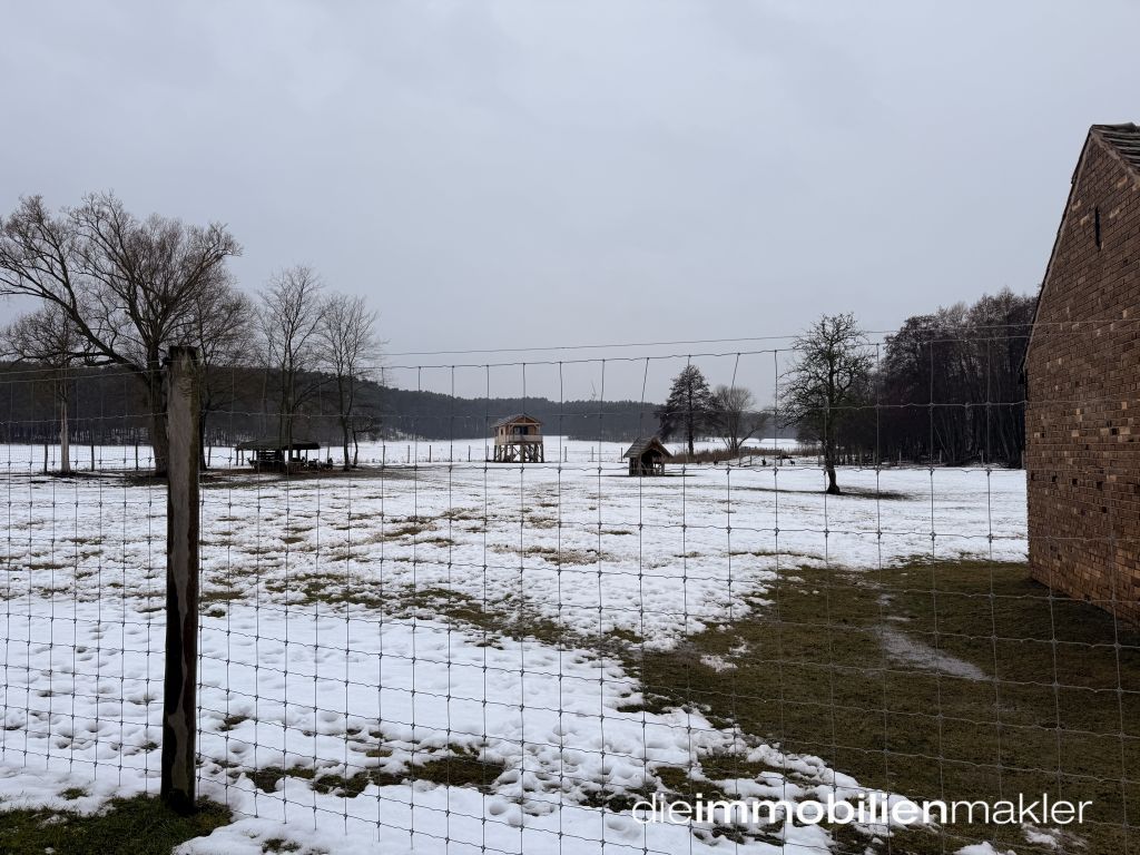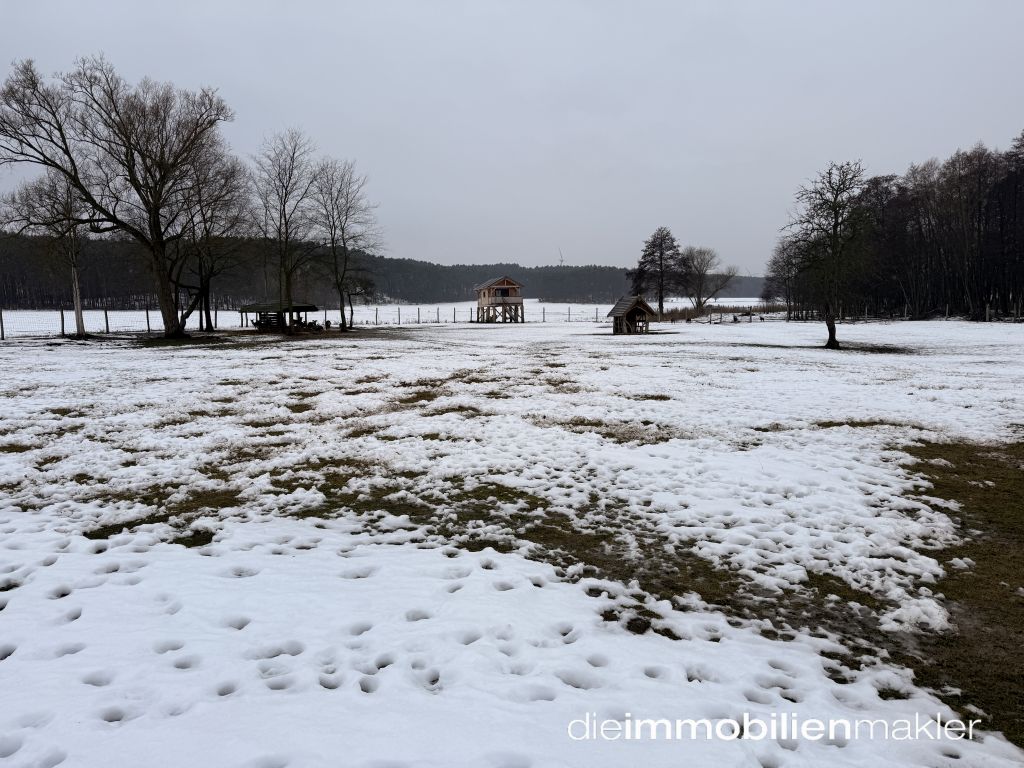 sich eine große Grünfläche, die ideale Voraussetzungen für Weidehaltung bietet. Aktuell wird das Areal zur Haltung von Dammwild genutzt, was die Eignung des Grundstücks für Tier- oder Pferdehaltung eindrucksvoll unterstreicht.