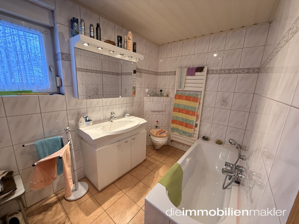Im Erdgeschoss stehen eine Küche mit Einbauküche und kleiner Sitzecke, ein großzügiger Wohnbereich mit Esszimmer, ein Schlafzimmer und ein Bad zur Verfügung. Das Bad wurde 1995 modernisiert. Badewanne, Waschtisch, WC und bodentiefe Dusche sind vorhanden.